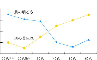 透明感のあった肌の明るさも30代半ばでガクンと低下し、反対に肌の黄色味は年々増していきます。このターニングポイントが30代半ばで『肌のくすみ』を加速させているのです。