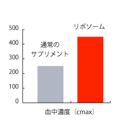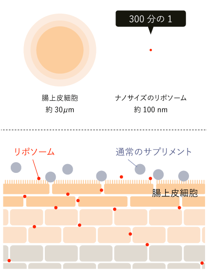 腸上皮細胞の300分の1のサイズで、リポソームの内部に閉じ込められた成分は、小腸から吸収されやすい特徴を持ちます。